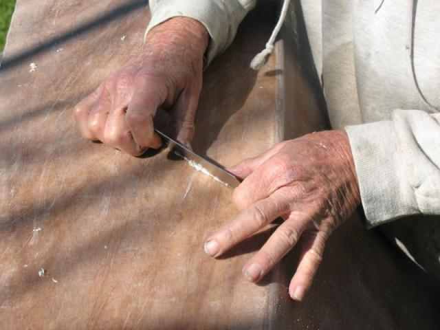 Some of the following will not be in exact order, but were set to show a sequence of events. The rolled on coat of epoxy from the last step took some time curing, since it was pretty cool, so the dinghy got carried outside to bask in the sun for two days. Once it had cured enough to work, if first had high spots taken off with a cabinet scraper.