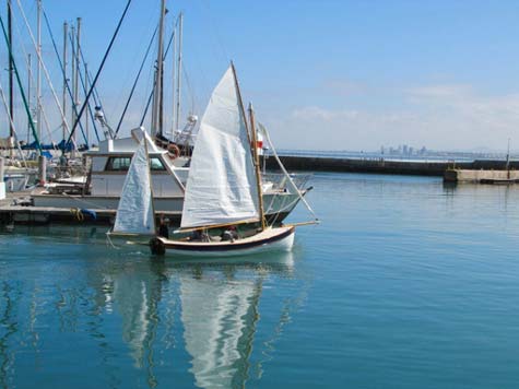 My first sail, with Steve and his wife Claudia, was out of Gordons Bay, a town on False Bay near Cape Town. False Bay is about 22 nautical miles across from Gordons Bay to Simons Town. We left the harbour under power of the little electric trawling motor. The power source is a 105 amp hour battery in a watertight compartment under the starboard thwart seat. The motor was modified by shortening the shaft so that the tiller can pass freely over the top of the motor. Although the motor does not have the thrust of a petrol outboard, it pushed us along at 5 knots and served it purpose, to get me from the trailer to the open sea and back on the trailer after the sail, just fine. To move along without any noise was a definite plus.