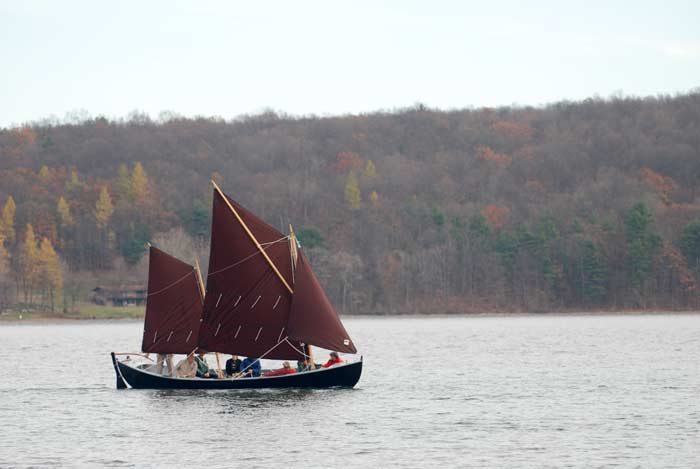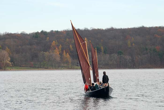 My son and I took two willing but inexperienced sailors with us in 20 kn winds a few weeks later. Running downwind from the launch at Tremain park under mizzen and jib, we reached the south end of the lake , and throwing caution literally to the wind, we deployed the main and turned into a beam reach, "cracking on to make all sneer". Within about 30 seconds we had carried away the peak outhaul cleat on the mainsail . So we struck the main and carried on with jib and mizzen, roaring across the 3 foot waves and reassuring the squeakers. No spray, no untoward or awkward behavior, just an exhilarating day on the water. The hull tracks well with little leeway (centerboard down) and the rudder is very light in the hand and turns the boat quickly. I don't have any photos of this, but lots of people took them from other boats; anyone out there have some to share?