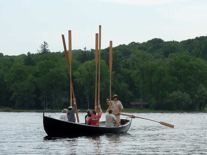 Here it is is fully rigged, 15" & 16" foot oars stowed on the centerline, with the 17' and steering oars hung in the oar locks.