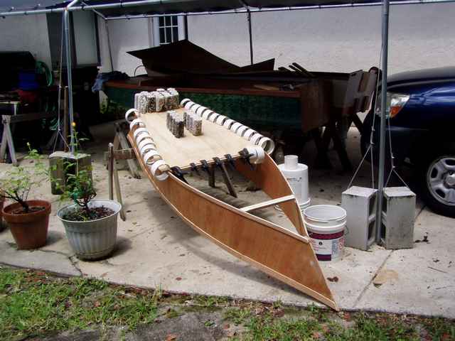 Next, we flip it over and set the mid point at 30 inches with a cross member. When we pull the stern in to 12 inches we can dream a little what it may look like when finished.