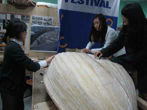 In order to waterproof her, we put glass fiber on vulnerable segments and varnished whole body; this led to her being even heavier. Around this point, it was no longer possible to lift her with one hand though she was still light enough for a yacht.