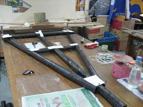 Last time when we carried HD24 to the Han River behind our school, a heavy wooden-made wagon made us sweat a lot. Therefore, a need for a new trailer to carry her occurred to us. We decided to make that trailer as light as possible as we did on our yachts and used wheels form a wheelchair, which had been in our club room, and some carbon pipes for building. By this point you might think our club room must be quite messy, and I have to say that this room is more like a chamber of secrets than any other ordinary club room.