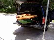 This went well with a short fat canoe as the result. My next decision was to add a front deck and a closed storage compartment at the stern. The gunnels were ripped from 2x4's as were the braces. The top of the rear compartment is 3/8" plywood to support a short fat skipper. The front deck is more Luan, curved slightly. A heavy duty cross member will help the old skipper up and down.