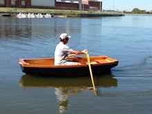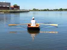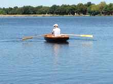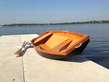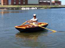 I’m happy to report that WeeVee lives up to all of my expectations and more.  At about 40lbs., I can easily lift her into my truck bed and go.   The long, slim oar blades move her along at a nice clip, and the extra mass in the square looms reduces the lifting weight of each stroke.  The deep V bottom slices through smooth water with astonishing speed for a short boat, and she tracks well ahead.  Stability isn’t really a problem with one’s weight on-center, the trickiest part being climbing  in and out.  I recently went rowing in a good 12-18 knot blow.  WeeVee bobbed over the small waves, and was only a bit more squirrely with quartering swells.  She’s a really sporty little boat to row.