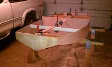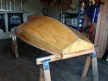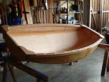 The stitch-and-glue part followed, and was remarkably simple.  I referenced Jim’s book Boatbuilding for Beginners (And Beyond), which goes into great detail about taped-seam construction, and had seen Warren Messer’s Red Barn Boats YouTube videos as well.  Creating the curved V shape with the bottom panels was especially cool.  The panels are laid face together and stitched along the bottom seam, then opened up like butterfly wings.  When spread open, the stitched edge forces the panels into an arching V, which then fits perfectly against the V shape of the transoms and temporary form.  Really neat!  I used a tube of Gel Magic thickened epoxy to set the seams, removed the wire stitches, then applied 3” fiberglass tape set in epoxy. I sheathed the hull’s exterior with 6oz. fiberglass cloth, again set in epoxy. This added time and expense, but in the end I don’t worry about the strength of the Luan or storing the boat outside.  I designed-in a little flair by shaping the knees and bow cross piece, and by using spare bronze screws where visible.