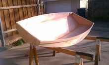 Once the transoms had been built up, the side panels bent easily around the temporary form and spreader pieces.  The bevel angles provided in the plans made attaching the sides to the transoms a snap, and after these initial joins I got my first glimpse of the little boat’s lines.  I used a long 1x2 batten to keep everything straight, and “eyeballed” the horizontals of the transoms and formers to keep it all level. Tightbond III was used for gluing where a good wood-wood surface was available…yet another nod to simplicity and thrift!