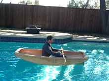 After the hull was glassed, I plopped the WeeVee in the pool and clambered aboard.  The inertia of simply getting in the boat sent her gliding across the surface, which hinted at the slippery speed of her V hull.  To the great amusement of my wiener dog Max, I flailed about trying to establish a good balanced location for the thwart. The plans provide sail rig specifications, but I intend to use this boat as a one-man exercise machine exclusively.