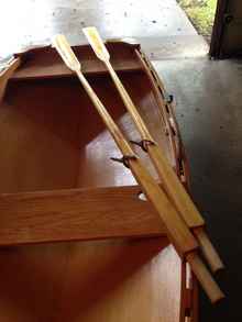 The oars were made from 8’ clear pine 1x6 boards, which were soft and very easy to work. They are light, plenty strong, look nice varnished, and superbly balanced. I went with a 7’ length, and followed the detailed instructions in Jim’s book. Also, I fixed the oarlocks in place with pins that run through the oars. I get a better rowing experience and better control with fixed oarlocks. This is entirely a personal preference.