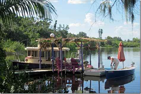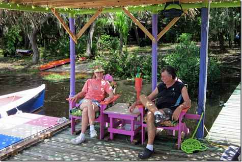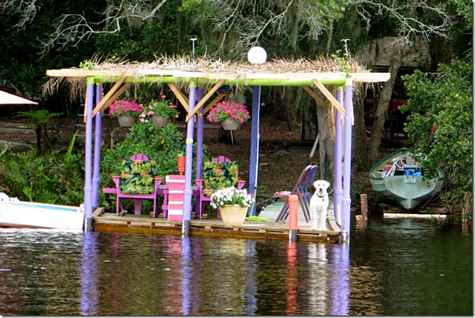 Paul and Lauren came by to see this extreme dock I just finished. They have a backyard that's planted with all kinds of exotic stuff and Paul was telling her how I had this self watering dock. Naturally she said, "what the hell is a self watering dock", I would. Look at the top of the purple pipes at the green plants growing out the tops. Her pictures show this better than mine did. The up and downs are full of dirt and the sideways ones are hollow and connect the whole thing. The hanging pots are below little holes I drilled so when I open one valve everything get watered in about thirty seconds. Steve is also in this one with his giant umbrella boat.