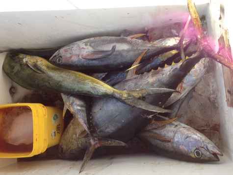 Two Mahi at night, one about 10 lbs one about 5 lbs, 4-5 big shark bite offs.