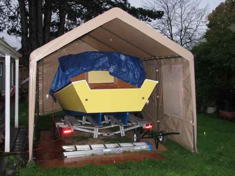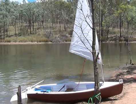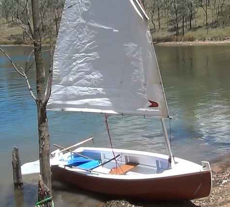 This little boat I finished a little while ago and just launched it at Christmas. This Tuckahoe 10 is a skin on frame/plywood hybrid and probably one of a kind. The bottom is plywood. The skin is epoxied over the plywood and continues up the side. I think the boat is about 40lbs. I used 8oz polyester Dacron and stainless steel staples. The frames are 12mm plywood and the stringers are Paulownia. The rig is off Queen Mab by Bolger and the Rudder is off a PDR by Michalak called Catbox. The dagger board is part plywood with about 12 pounds of steel in its lower half all below the waterline. It has rope steering and a love seat in the centre that goes all the way across (not to plan) but the boat is a one person sailboat though. It has foam wrapped in blue tarp front and back for floatation. It moves with a little puff of wind. I like this boat and recommend it.