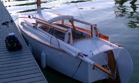 I recently launched "Otter", a self designed cuddy cabin boat with a lot of "inspiration" from Jim Michalak's "Sow's Ear" design. It's 17.5 foot long, has a 6 foot beam and is a flat bottom boat. It has a 6 foot cabin, 8 foot cockpit, rear motor well and front anchor well that is also a front access for boarding while beached. Here are a few pictures and a link to a video I put together of my first overnight trip on Sugarloaf Lake in Southwestern Michigan. She sports a fiberglass and epoxy skin supplied by Duckworks.