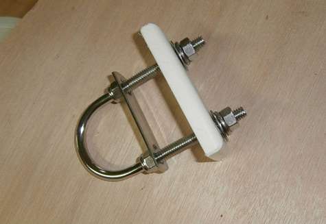 A five dollar bow eye. Lowes has stainless U-bolts and I have scraps of StarBoard. Added a couple of nylon lock nuts and viola. Drilled and got a perfect fit (rare). Today I also added some cleats to the cabin bulkheads and coated the underside of the decks with a heavy coat of epoxy.
