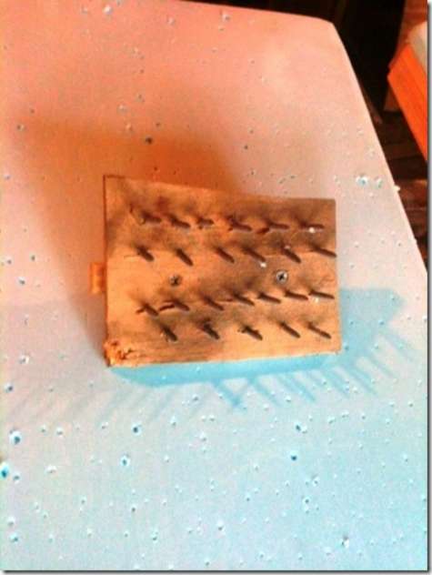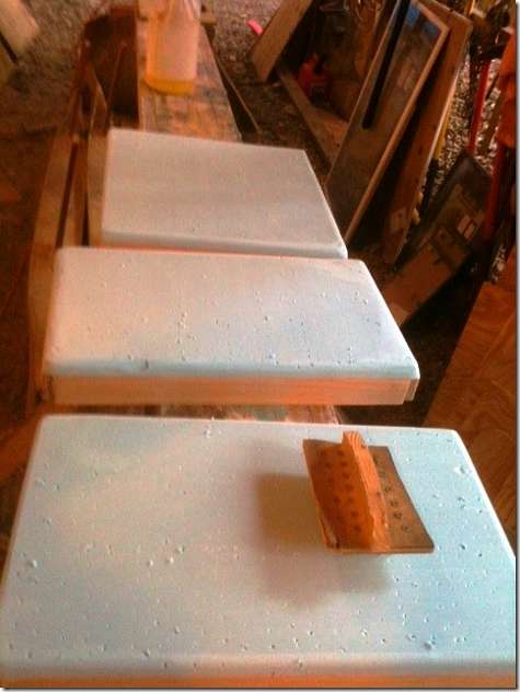 Good timing, I'm in the process of making hatch covers using blue foam right now. The blue foam is much stronger, pretty much totally water proof but it's tight, smooth surface isn't too good for sticking glass to. The epoxy sticks just fine but it's easily pealed off along with a microscopic top layer of the foam. If you glass straight onto this foam you'll later notice hand size bubbles in the cloth where something has caused the glass to lift probably due to heat. Barry did his usual detailed research and discovered that the hard, dense blue or pink foam contains a gas inside from manufacture that may come out and cause these bubbles. The white less dense foam doesn't seem to have this problem. In order to prevent that from happening you need to roughen up the surface so the epoxy goes in deeper to hold better. We've tried sanding with rough sandpaper but this custom tool works best for me. You just go all over the surface and jab a lot of holes down into the foam; you can see how complicated it is. It goes real fast. After you sweep off the foam crumbs you could glass right on top but that would be way too easy and won't work. You'll just end up with a bunch of air holes under the glass. You have to pour some epoxy on and spread it all around and fill the holes.
