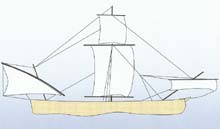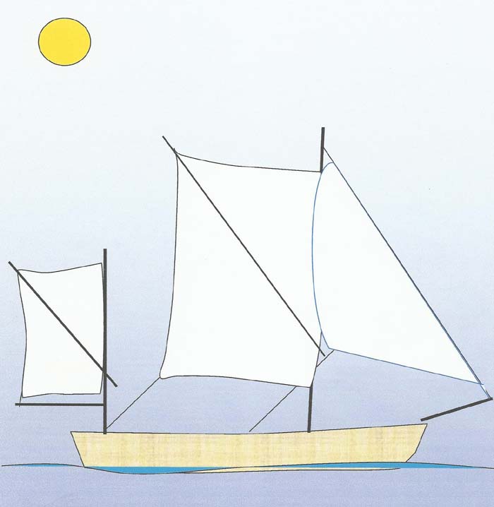 The Moletta was also a fishing boat from Portugal, where their inspiration for sail shape seems to have been diapers. There's actually only one mast here, but plenty of leaning on it. If there's an advantage to all these triangular sails it's that you could sail in the opposite direction without turning the boat around. Does the crew know which way they're going? I can't tell, but it looks like plowing downwind on a Moletta would be a hair- raising experience. Maybe the crew does the screaming, instead of the wind. If I were a fish, I'd be insulted to be caught by this boat.