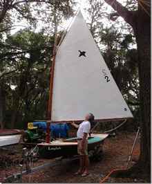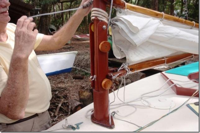 This in my tabernacle I made so raising and lowering the mast would be easy and it is. All I have to do is unlace the lines holding the gaff and boom jaws, pull the bolts, attach the lever to that eye bolt and it all comes down with one hand. All of the lines are still attached so it only takes a minute to put it back up and be sailing. I made it from a three inch pvc pipe that I cut and shaped and glassed. PVC becomes very soft and flexible when you heat it so you can get just the shape you need. It has to be heavily reinforced with either fiberglass or carbon fiber; I used both. The mast has to be reinforced here at the pivot point also.