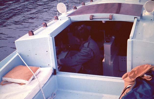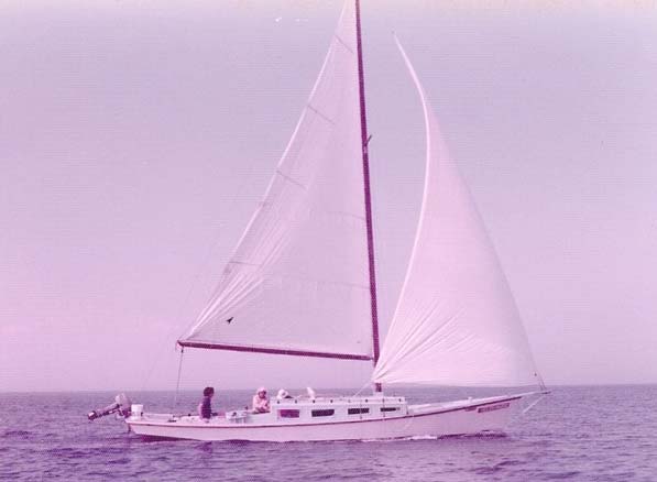 The plans call for a hull 36 feet long and 10 feet wide, ours ended up 37 by 10 with a three foot long bowsprit. We didn't have much money so we built the boat light and cheap 2X6 frames and half inch plywood and a very simple interior and no systems of any kind. The only through hull fitting was one drain for the cockpit. Covered the whole thing with fiberglass mat and polyester resin. A big investment was 2000 pounds of steel punches for ballast.