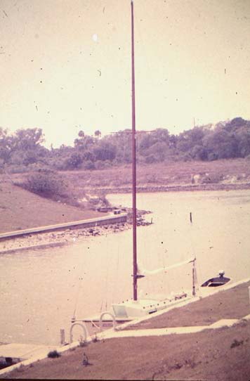 Here she up on the railway. You can see why this hull shape would surf. Everyone at the Tampa Sailing Squadron enjoyed this boat, she was perfect for rafting up along side and the giant flat deck and cabin made a good gathering place.