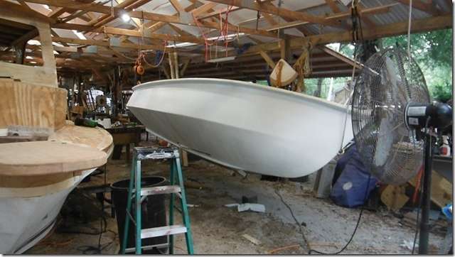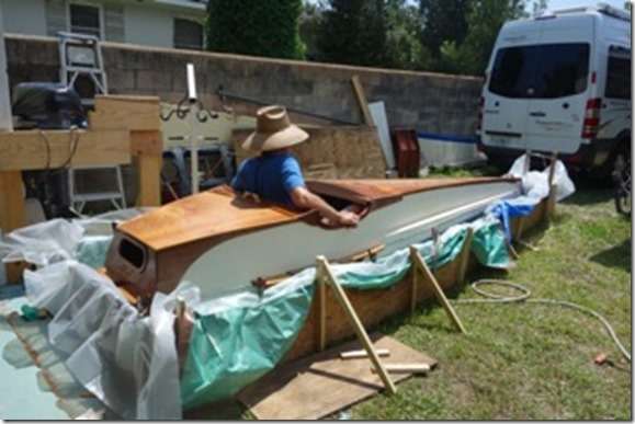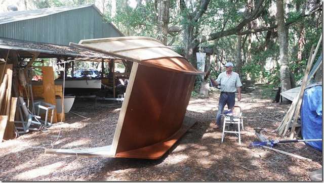Stan's junk looks sort of like a junk or a landing barge. It's lacking ends but does have a painted brown bottom. Stan does things a bit differently than most of the rest of us. When I say this is the biggest sixteen footer you ever saw I ain't kidding. This isn't a trick picture, he really is standing next to it with a roller in his hand.