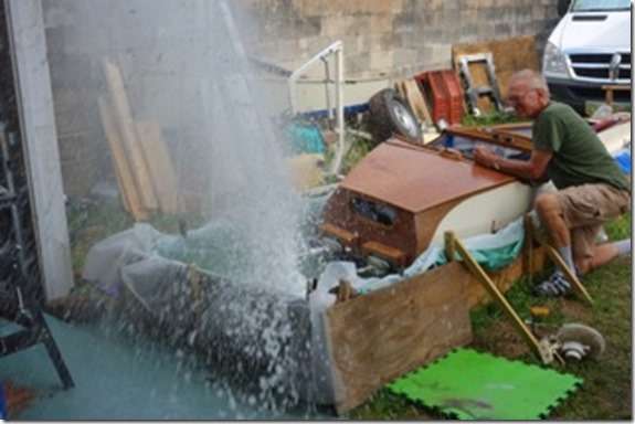 Well, I take that back, I do know someone else who's a strange boat builder or should I say who builds strange boats? I think it's both in this case. This is Jay Bliss doing some tank testing of his new high speed electric race boat. He's probably doing this while Peg is off somewhere. Jay is famous for his designs. He thinks of something and builds it with absolutely no regard of what anyone else thinks he should be doing, that sounds familiar doesn't it, I wish he lived next door to me so I could watch him make this stuff up.