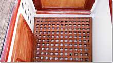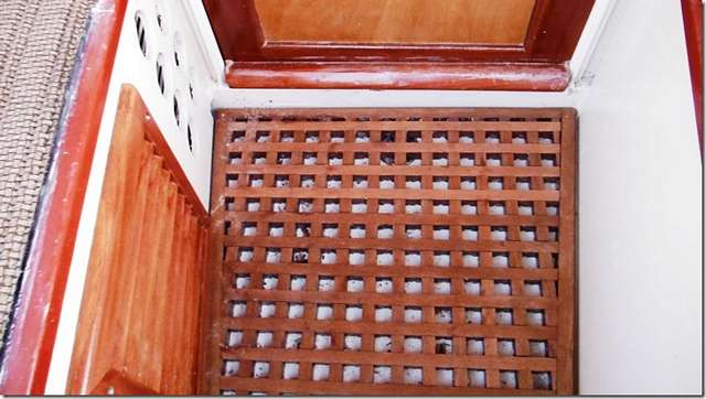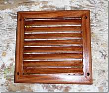Here's something for you to ponder. We've all gone to acrylic latex paint for our boats, actually the new ones are all acrylic, whatever that is. These paints last forever, don't fade or chip, are water proof and simple to touch up and clean up. But we're still stuck with the horrible problem of trying to live with bright work. Well you are, I've pretty much given up anything that looks like wood. There are three things on the outside of Helen Marie that hasn't been painted, this vent, the floor grating and the door which is starting to go to hell. So what would happen if you used water based varnish? Would it hold up like the paint does? Would it just sort of wear away and not chip and need to be sanded down to the bare wood? I sanded the floor grate about a year ago, the good varnish had lasted less than six months, and put on four coats of this stuff. It's really easy to put on since it's water. I just slopped it on and blew the excess off with the air hose and it still looks the same as when I put it on back then. And it dries really fast. It doesn't give you the deep high gloss look of "real" varnish but if it lasts who cares other than the nuts who want to impress us with their mirror finish. The side vent went on last week after hours of sanding the old cracked stuff off and three coats of this put on, I'll let you know how it holds up.