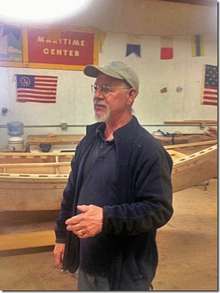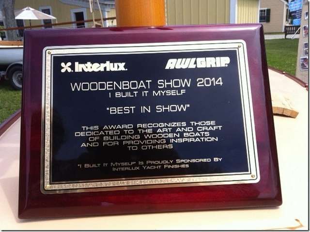 I've talked about Richard Honan building a Melonseed. He finished up last month, took it for a trial sail and then down to the wooden boat show in Mystic where he won this; Best in Show. Not bad for an old Yankee on his first time out. Notice that the plaque is covering up the boat so we can't see.