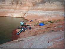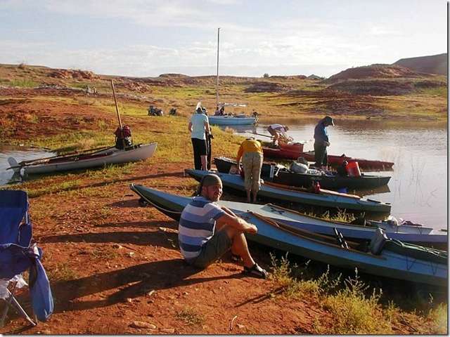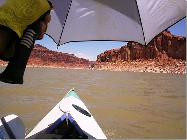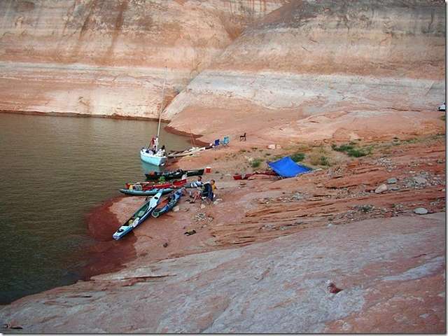 Chuck the Duck of Duckworks magazine went up to Lake Powel on a kayak trip with some of his pals. Says the lake level is down a hundred feet and good camping places were few and far between. Hot and dry describes this area. How can there be nothing growing along the shore? Surely some grass seed would blow in, something. These pitiful little scrub plants don't really qualify. He said that he was clipping right along with this umbrella sail. Helen and I were there a few years ago and almost drowned in the lake. We hadn't swam in fresh water in decades and didn't float at all.