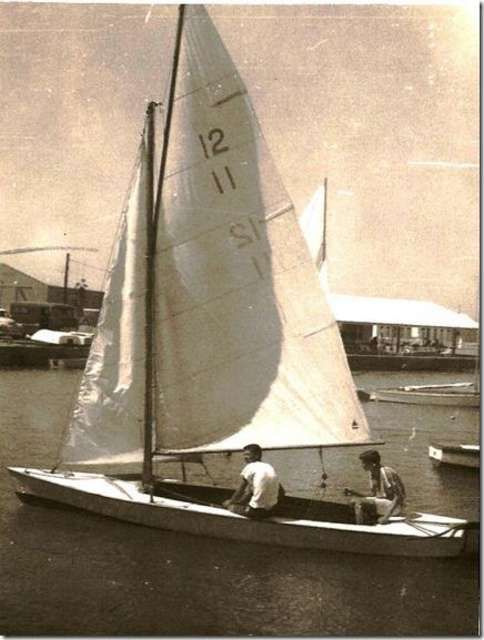 The old picture is of my brother and I sailing a twelve square meter sharpie back in 1961. These boats were in the Olympics back in the day as the two man non spinnaker dinghy class. Talk about a thrill, 20 feet long, 4.5 feet wide, flat bottom with 140 sq feet of sail. Notice the wishbone tiller and the unusual mainsheet block arrangement.