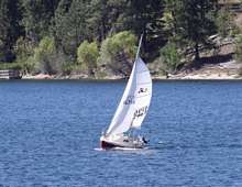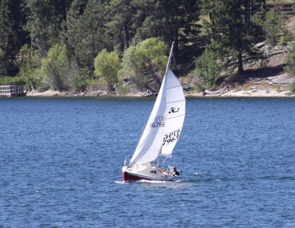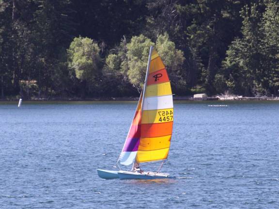 I wouldn't say that Diamond Lake is a hotbed of sailing. Amid a forest of Chev 350 powered ski boats, and plush-seated pontoon palaces with purring four-strokes; there are only about half-dozen rag baggers strewn along the shoreline. Most times, Lady Bug is the only one to actually venture away from the dock. Today, the pheromones must have been active. As I was reveling in my new-discovered sailing sophistication, there was this Prindle Cat chewing up the distance to leeward. Hey, we could never manage to actually stay ahead. But, as EVERYBODY knows, the definition of a sailboat "race" is that occurrence when ever two boats come in sight of each other. So, the "race' was on.