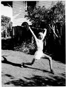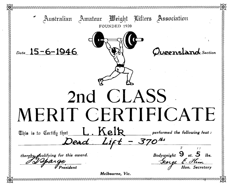 Leo was very active before marriage though and had friends who did balancing and weights. Leo had a few Queensland records for weight lifting. He lifted 370lbs in a dead lift which was to his waist. He actually weighed 8 stone, 13 pounds and was a bantam weight - the lightest class. The certificate got his weight wrong. He was 6' tall. He did weights until around the time I was born when he was 45.