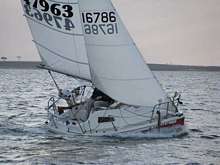 Lady Bug is short, heavy, and kinda' slow. An 1,800 pound 16-foot pocket cruiser. Ballast keel, and essentially un-capsizeable. I've finally gotten a decent reefing system working on the home brew beach cat rig. Other than occasional leaps for the sky when crashing over a breaking sea, and my residual fears of losing the stick to a broken shroud, or something like that, she was handling the situation with aplomb. In fact, other than a bit of spray over the bow, we didn't take a drop in the cockpit. Nothing much came unlodged from its perch in the cabin. The boat was doing famously. And, the skipper was doing OK too.