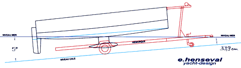 She is trailerable too. (boat,625kg + trailer,180kg = 805kg to be trailered). When the boat is driven in the water, the trailer is immersed (like the open boat of the same length): a rope is placed betwen the ball of the car and the trailer. in the diagram below, you can observe that the fixed rudder-skegs don't touch the bottom.