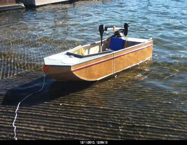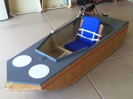 The hull could be constructed using 1/4" plywood, for greater durability, or the exterior could also be fiberglassed, allowing yet thinner and lighter plywood hull building material. Again, builders choice.