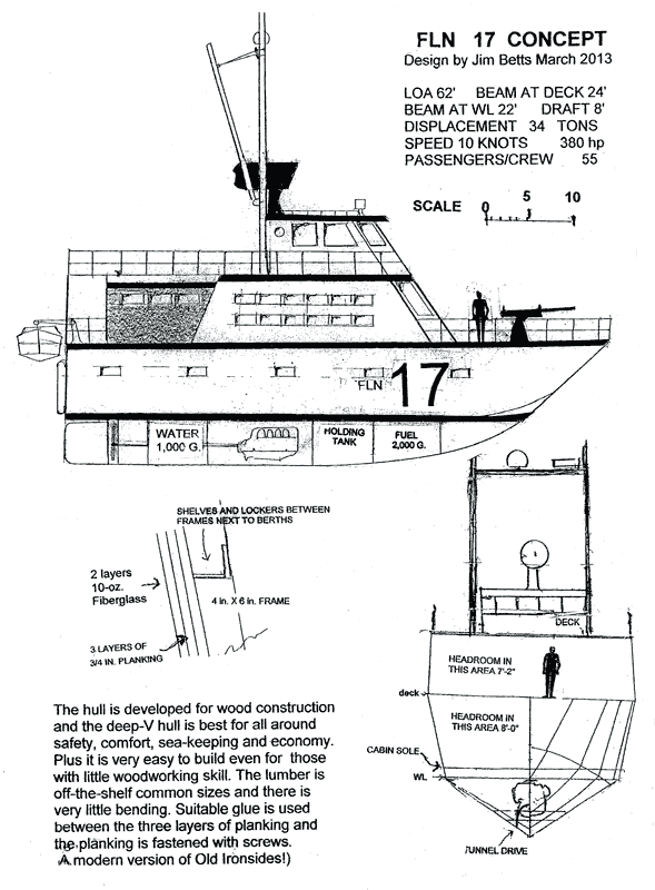 The vessel has some unique features. The hull is built of common one—inch lumber in three layers like the PT boats of WW 2. It will finish 2 3/4 inches thick and will be almost as strong as the USS Constitution "Old lronsides." The deep-V hull is easy to build as there is very little bending. The "crew" will build the boat in Mississippi at a shipyard with suitable facilities and they will live there for the three months building will take. The 55 men will work in two shifts and some will work on the interior components outside the hull and move them into the completed hull later. (This is the method of sub-assembly used by large cargo ships today.) With no labor cost and many labor-saving techniques, and the use of off-the—shelf materials and equipment and an economical l0—knot speed, the cost will be about $100,000 or one fourth that of a manufactured vessel of this size.