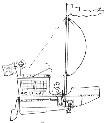 Here is a doodle of HMS VICTORY. This is fun to think about. If you agree, maybe this could run as a fun item. If anyone is interested I will go ahead with plans. I can draw up something better than the enclosed so it looks fairly serious. As I look at things at the Messabouts, this would surely be outstanding. A fun boat that does not do anything but be fun. Adult toy. The square sail can be made to sheet in and be a little handy on a reach, but it would not really work very well. Just a novelty. - Jim