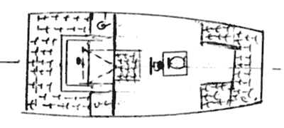 Wheel steering is by cables to rudder. There is room on the cabin top for gear. Supplies are stowed under seats and bunks. A small motor (say 3 to 35 hp) will most likely have fuel tank integral so carry spare fuel in a can. A small skeg ahead of the motor protects 1t from underwater obstacles. The motor may be on a rising bracket or fixed. When in port the sail maybe used as an awning over the deck, area. Use the booms to support it.