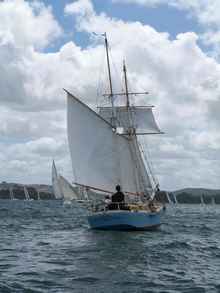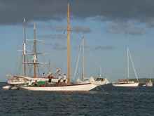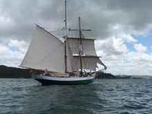 Another square rigger, "Coriolanis" is only about 32 ft long on deck, designed by Bernard Rhodes of Aucklands Waiheke Island she has had a chequered history but is now back in good shape and we see her out regularly around Auckland. She's a lovely little ship, quite easy to sail and much more practical than you'd expect. |