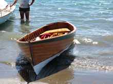 It must be more than 20 years ago that my friend Brian decided to attend a boatbuilding course at the local technical institute, (doesn't time fly when you are having fun!). They built this Sharp designed clinker (lapstrake) dinghy of about 14 ft x 4ft 6in. All traditionally built with copper rivets and steamed ribs, Kauri planks and lots of varnish. At the end of the course, the boats built were made available for purchase by the classmates. Brian put his name in the hat and when the lucky names were drawn he was able to buy one. He has since put a centreboard and sailing rig on his, and "Honey" has been a regular attendee at events like this ever since. |