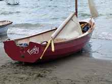 "Ellie" is a Beachcomber Dory with the stern built as a conventional transom rather than the traditional long overhanging tombstone stern. She's fast, the crew here are just picking up to sail out to the start line for their race, while the main is not yet sheeted on just see how well that jib is set. |