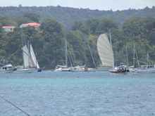 Junk rigged "Bootlace" working her way through the anchored fleet. While not a contender for line honours in the race, there would be few boats easier to handle or more relaxing to sail than this. |