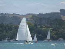 Now the regatta is held in the mouth of the Mahurangi estuary, the boats, all sizes, race from the start just off the beach out and around the island that shields the mouth of the river from the open ocean, back up the river about 3 miles, and back to the start. The small boats do the course once, the big guys twice so there is much crossing of courses, big among small, and some very close sailing.