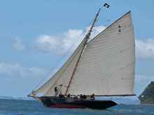 "Thelma" under full sail. Although these old cutters, this one 117 years old, wont plane like a modern high performance yacht they are no slugs. With that huge sail area, relatively light displacement and high ballast ratio they get up to hull speed and a little beyond very very quickly. |