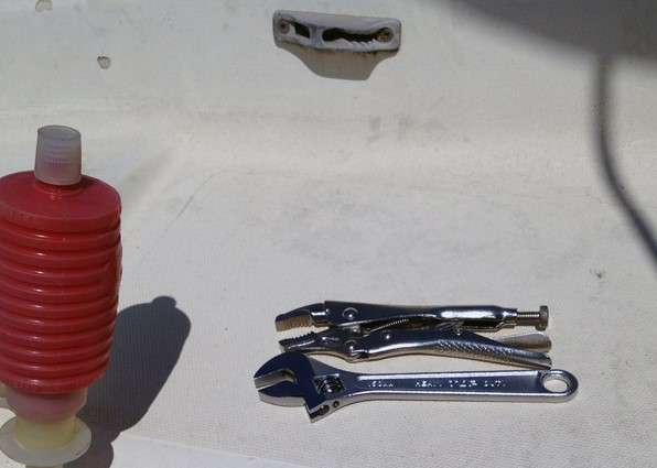 I removed the current fuel line from its outlet in the port side of the outboard well, filled the nut with polysulfide, and screwed it back on the nipple.