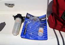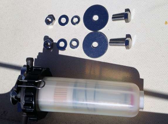 Solution: fit a fuel filter that's designed to remove water between the fuel tank, which is in a special vented stern locker, and the outboard, which sits in a well at the aft end of the cockpit.