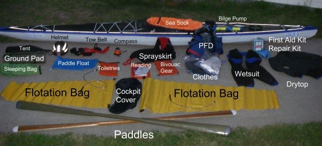 In the photo below, using kayak hatches in conjunction with gear/float bags, I was able to pack a week's worth of gear into an SOF kayak for a week long trip to the Apostle Islands in Northern Wisconsin. Not counting paddling gear, i. e., wetsuit, PFD, paddles, etc., I was able to keep the weight down to twelve pounds of gear. Note that the camping weight does not include food, but does include a box of wine.