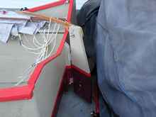 The beauty of this method, as Tom explained it, was that there is no chafe on the lashings, the top end could be epoxied into the hole and the bottom end made fast so that tightening could be done at any time. He was still pondering how to make the free end fast, see the last paragraph of this article, when I spoke with him. He did say that as far as he could tell once pulled taut the lashing didn't seem to move even with movement of the rudder.