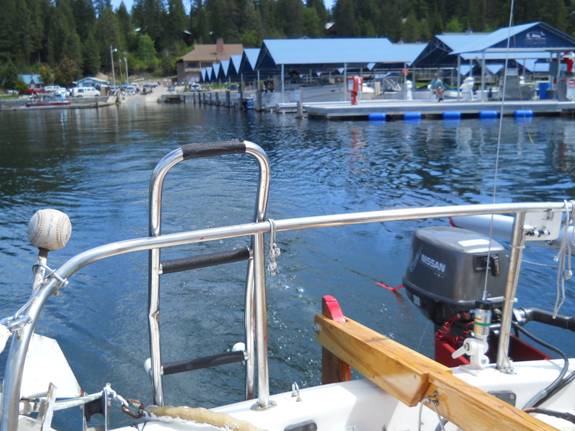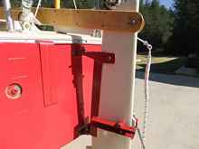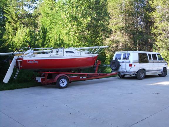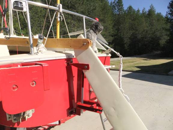 The rudder tilts up at about a 45 degree angle for launch and recovery from a non-extending trailer. I don’t approve of launching boats with the launcher wading around and getting his/her shoes wet. So, the result here is to launch Lady Bug with the tow vehicle’s tires uphill from the water. She rolls from a position where the keel is nearly dry, to floating, in a controlled fashion. And, except for once or twice, the rudder goes along for the ride without complaint.