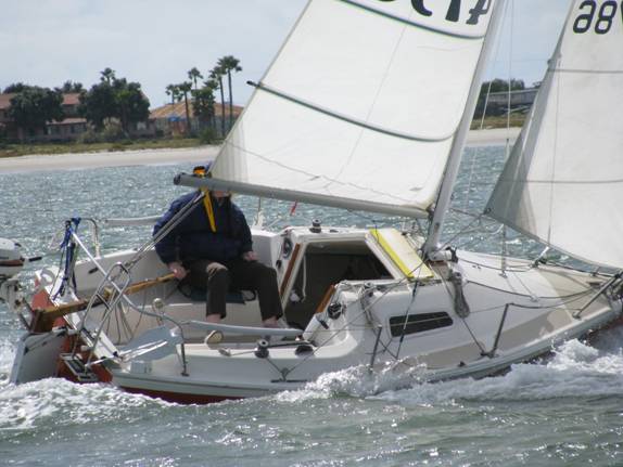 My particular home brew contraptions have morphed from the complex to the bizarre. This is an earlier version that was pretty complicated and the tiller was too short. But even here, with my friend, Roger, sailing with the main over trimmed in 30+ knot gusts, the little girl is going where she’s looking. And, that’s pretty close to success. |