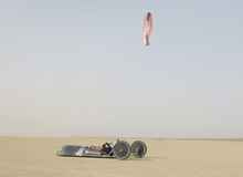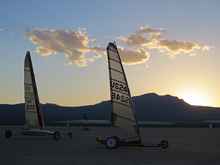 It takes a couple of hours of running back to camp to make adjustments, and then back out to test, before she finally gets dialed in and I can fully power up and cover ground. Few of my compatriots have sails small enough, or are willing to risk their equipment in these conditions, so I've got the place to myself. Normally the race course occupies the best surface on the playa, and the recreational sailing takes place around it. But now it's all mine! It's crankin' a steady 30 now, gusting into the mid 40s, and I can keep the Fed running over fifty mph for long periods of time, allowing the miles to rack up. The boat's feelin' good, steady at speed, leaping forward in the substantial puffs, scrambling to keep her footing, tires desperately trying to resist busting loose when we get slammed. As the sun again drops below the western horizion, I've covered 120 mile of lake bed, and decimated two front tires. I'm just back for another adjustment, and I get a tap on the shoulder. Dale offers me a warm meal and respite from the elements in the Eisenlohr palace, so I exchange a few more miles for a memorable evening with the family that's graciously adopted me.